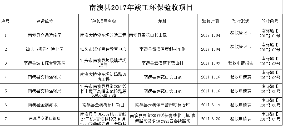 2017年上半年南澳县建设项目环保验收情况表