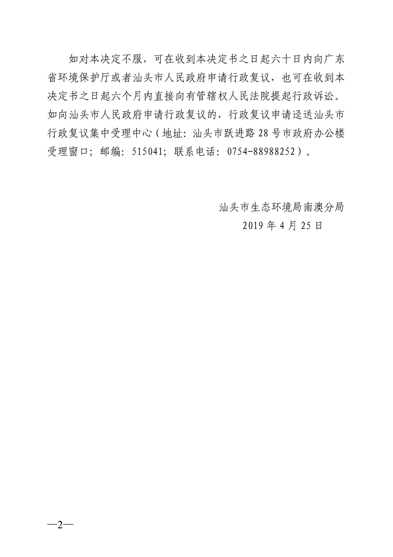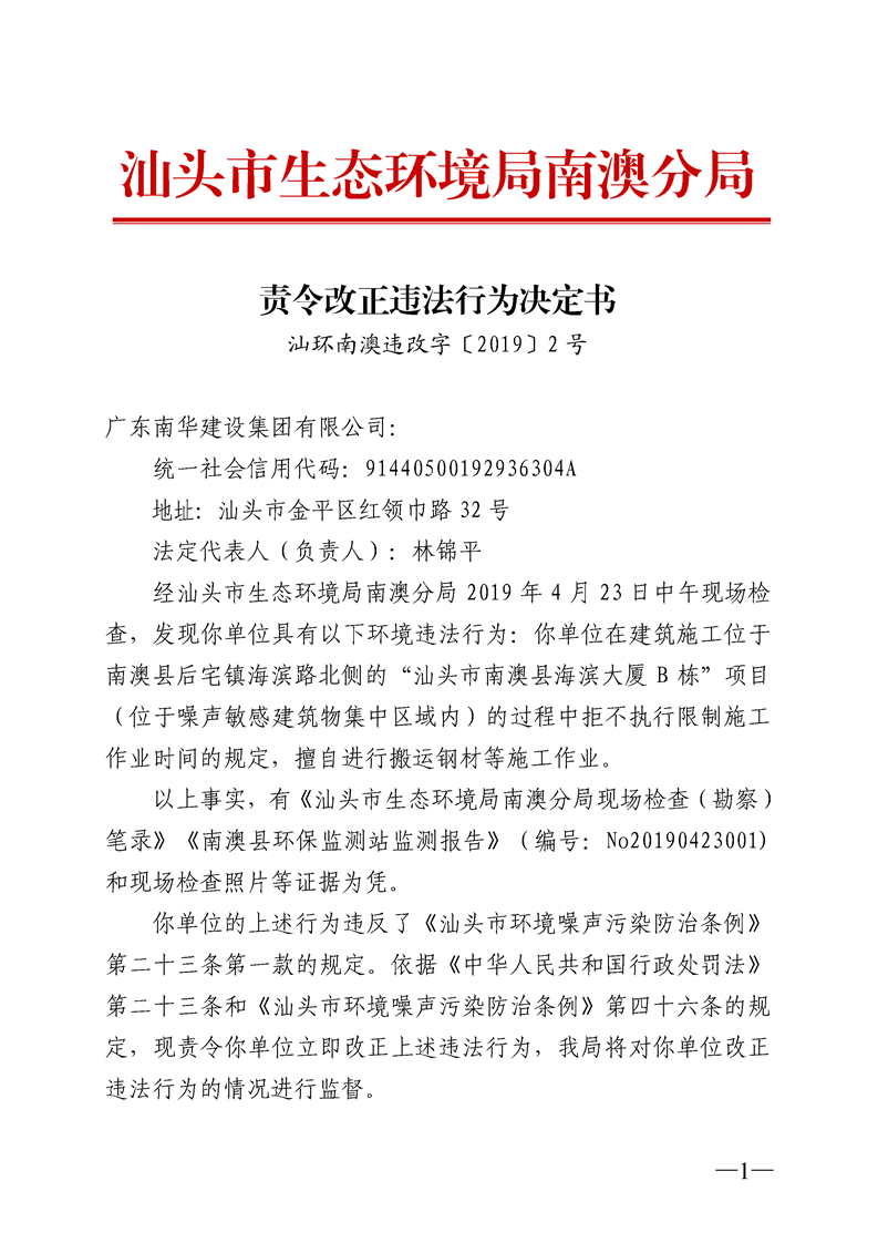 关于对广东南华建设集团有限公司下达责令改正违法行为决定书(汕环南澳违改字〔2019〕2号)的公告