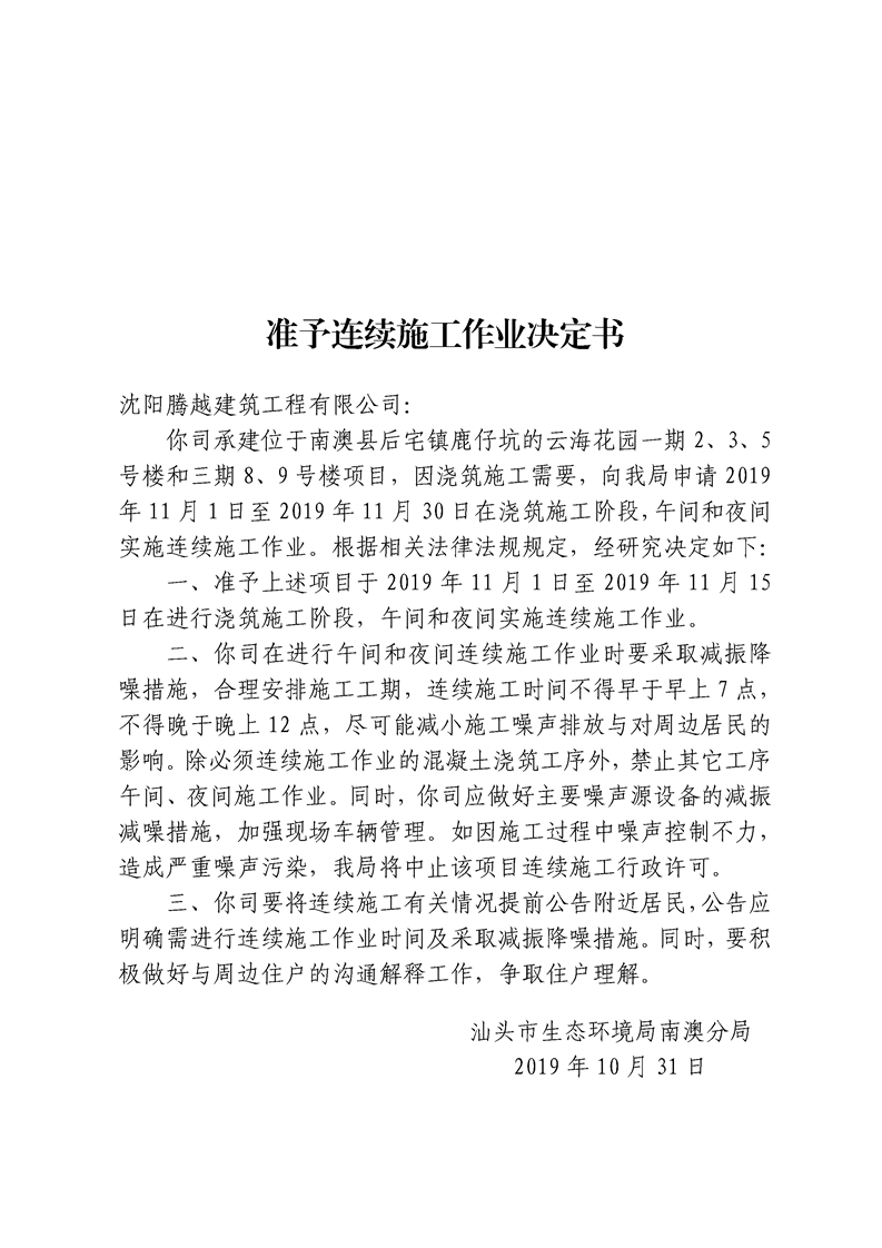 关于准予沈阳腾越建筑工程有限公司云海花园一期2、3、5号楼和三期8、9号楼工程连续施工作业决定书(2019年10月31日)