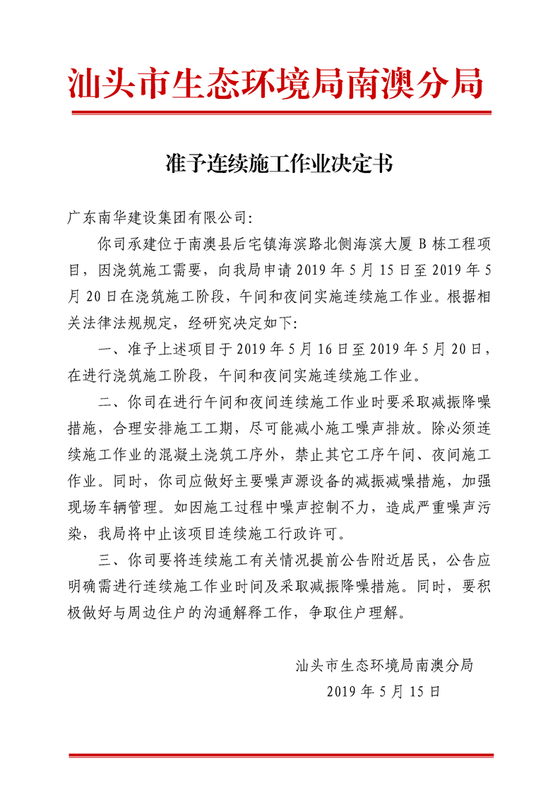 关于准予广东南华建设集团有限公司海滨大厦B栋工程连续施工作业决定书(2019年5月15日)