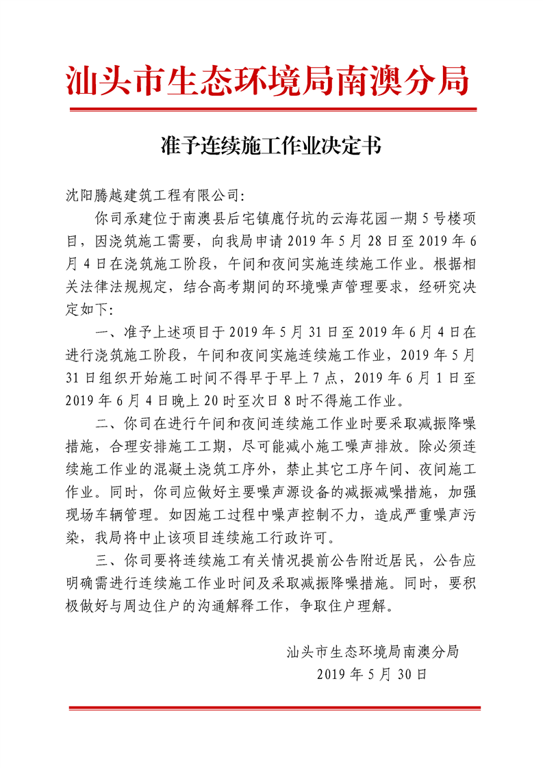 关于准予沈阳腾越建筑工程有限公司云海花园一期5号楼工程连续施工作业决定书(2019年5月30日)