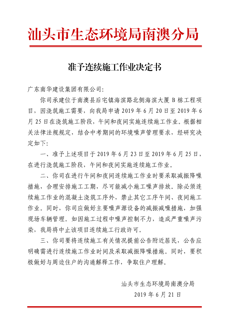 关于准予广东南华建设集团有限公司海滨大厦B栋工程连续施工作业决定书(2019年6月21日)