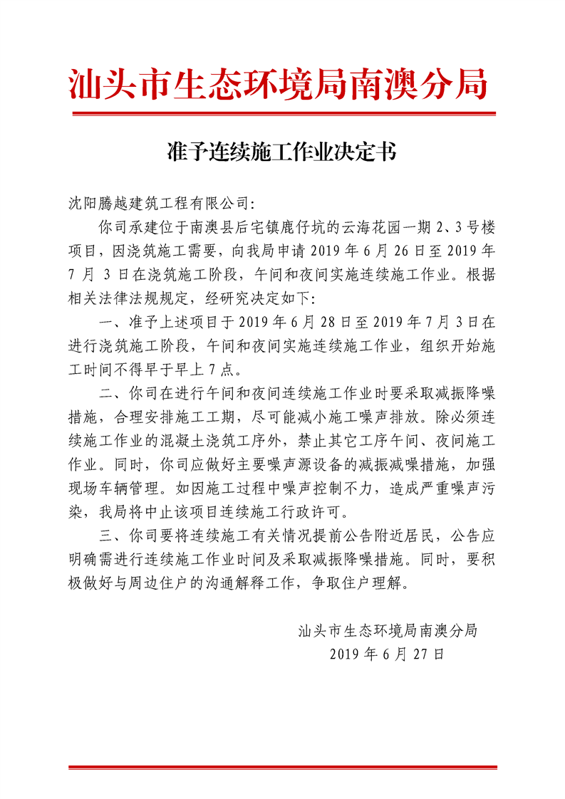 关于准予沈阳腾越建筑工程有限公司云海花园一期2、3号楼工程连续施工作业决定书(2019年6月27日)