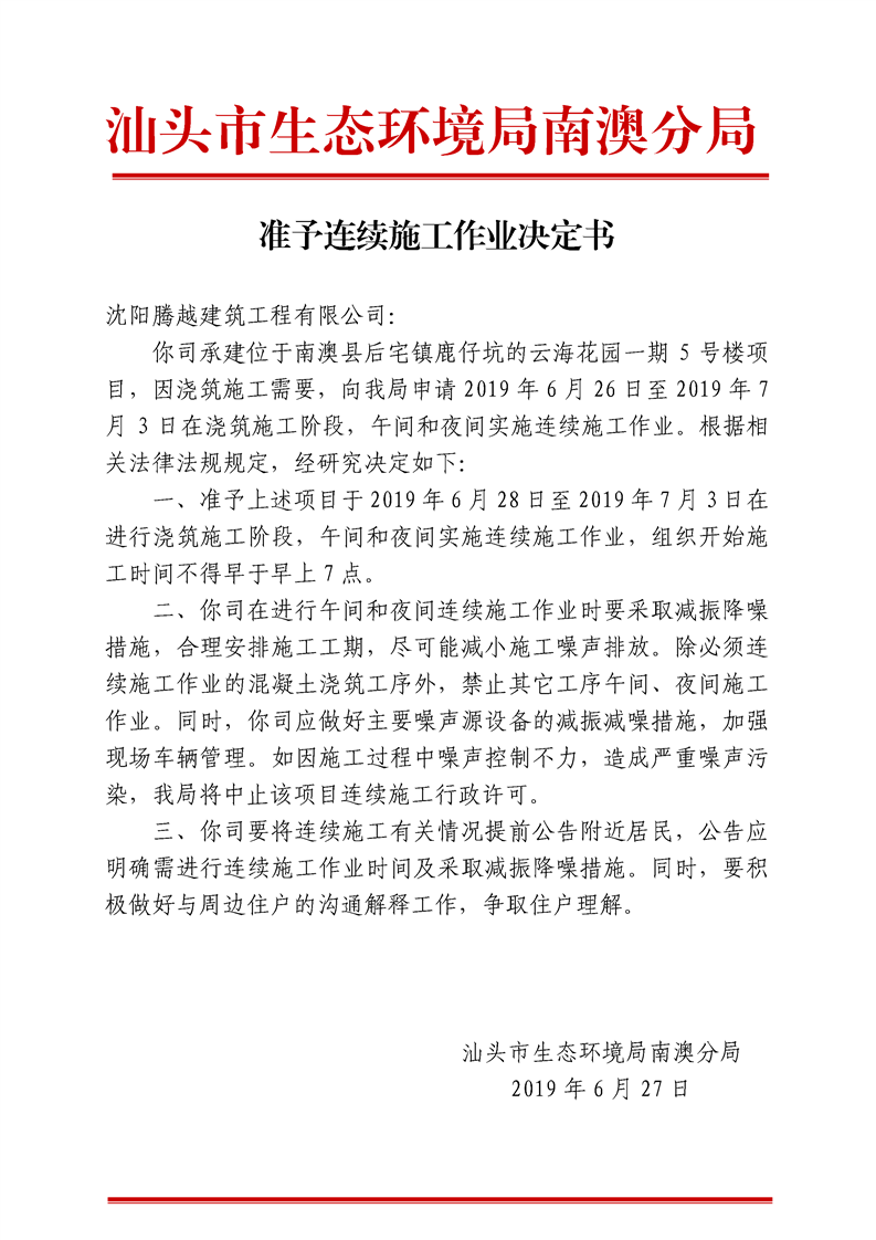 关于准予沈阳腾越建筑工程有限公司云海花园一期5号楼工程连续施工作业决定书(2019年6月27日)