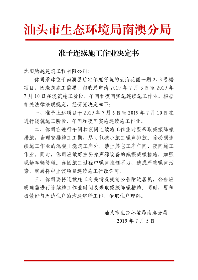 关于准予沈阳腾越建筑工程有限公司云海花园一期2、3号楼工程连续施工作业决定书(2019年7月5日)