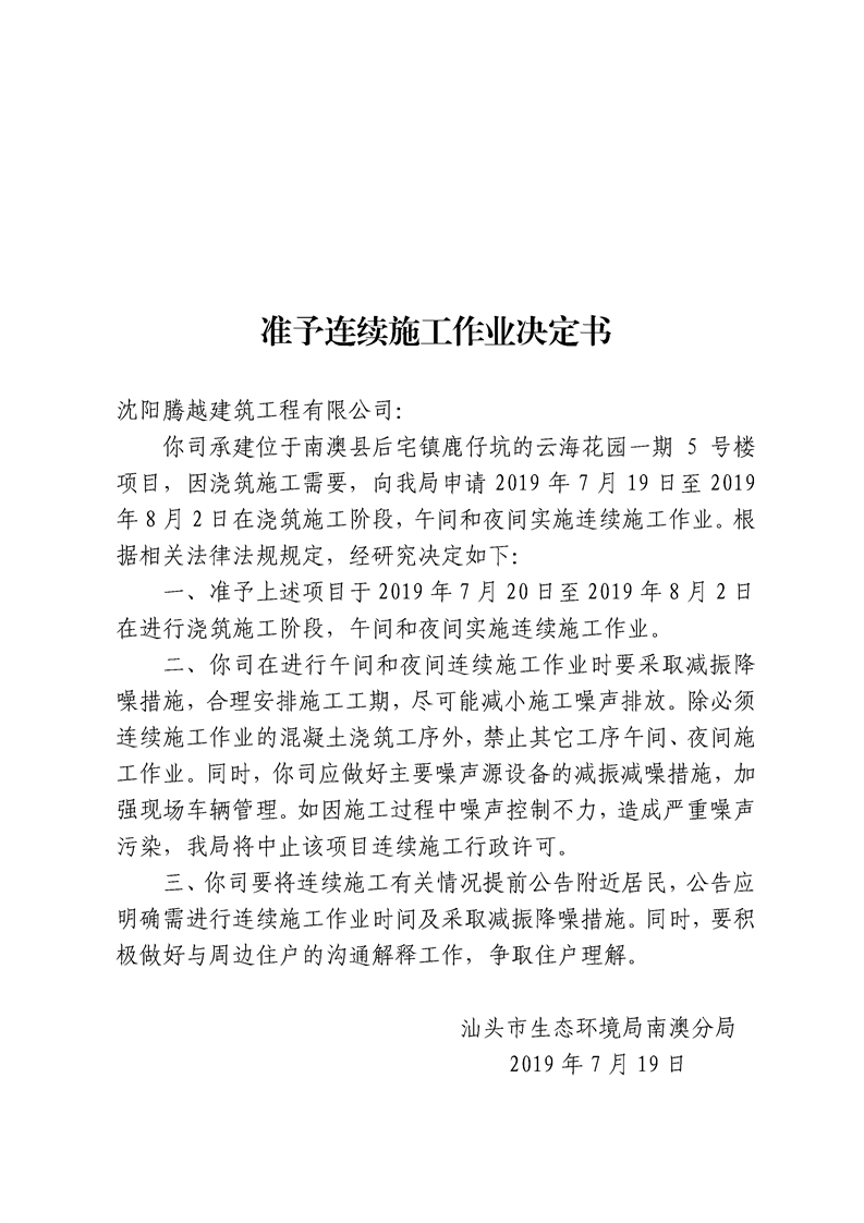 关于准予沈阳腾越建筑工程有限公司云海花园一期5号楼工程连续施工作业决定书(2019年7月19日)