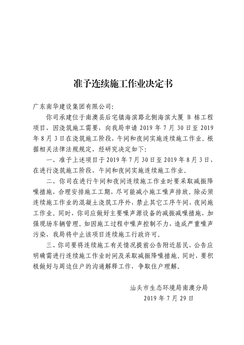 关于准予广东南华建设集团有限公司海滨大厦B栋工程连续施工作业决定书(2019年7月29日)