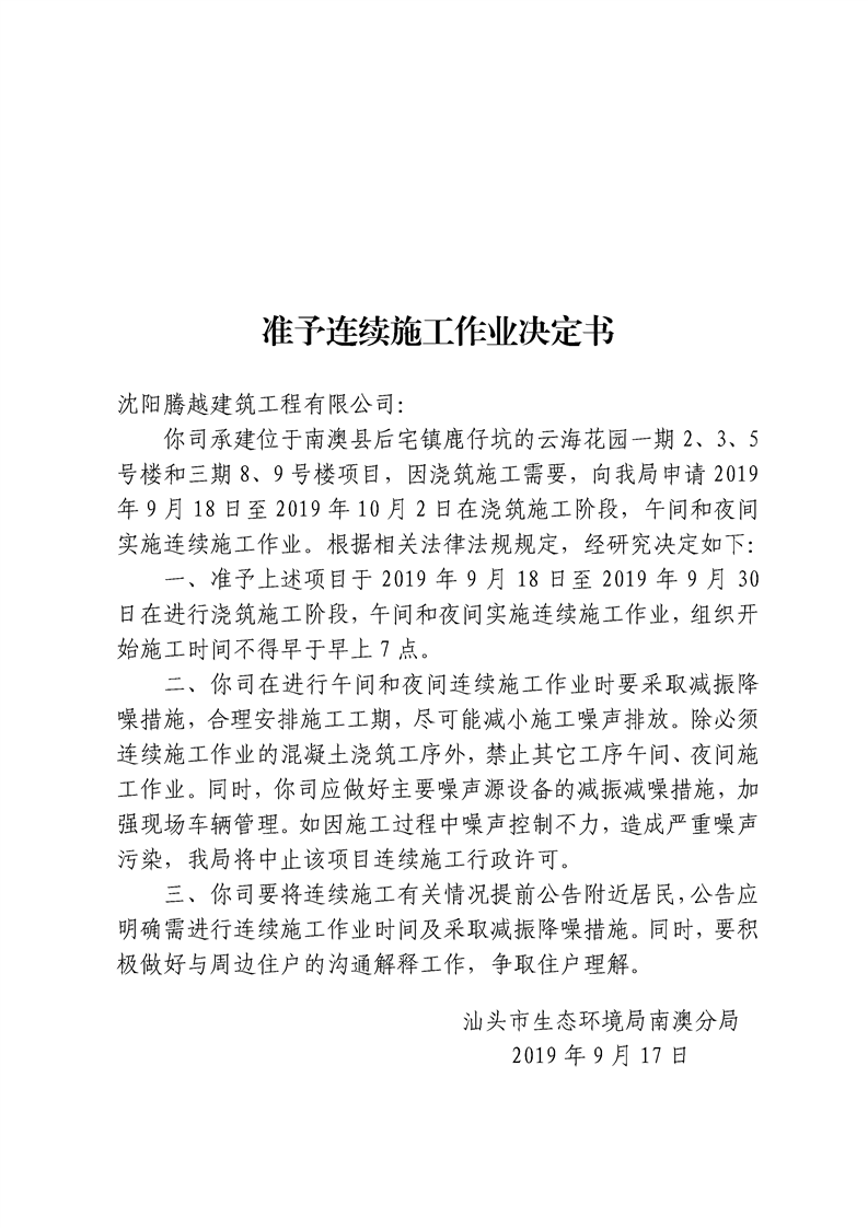 关于准予沈阳腾越建筑工程有限公司云海花园一期2、3、5号楼和三期8、9号楼工程连续施工作业决定书(2019年9月17日)