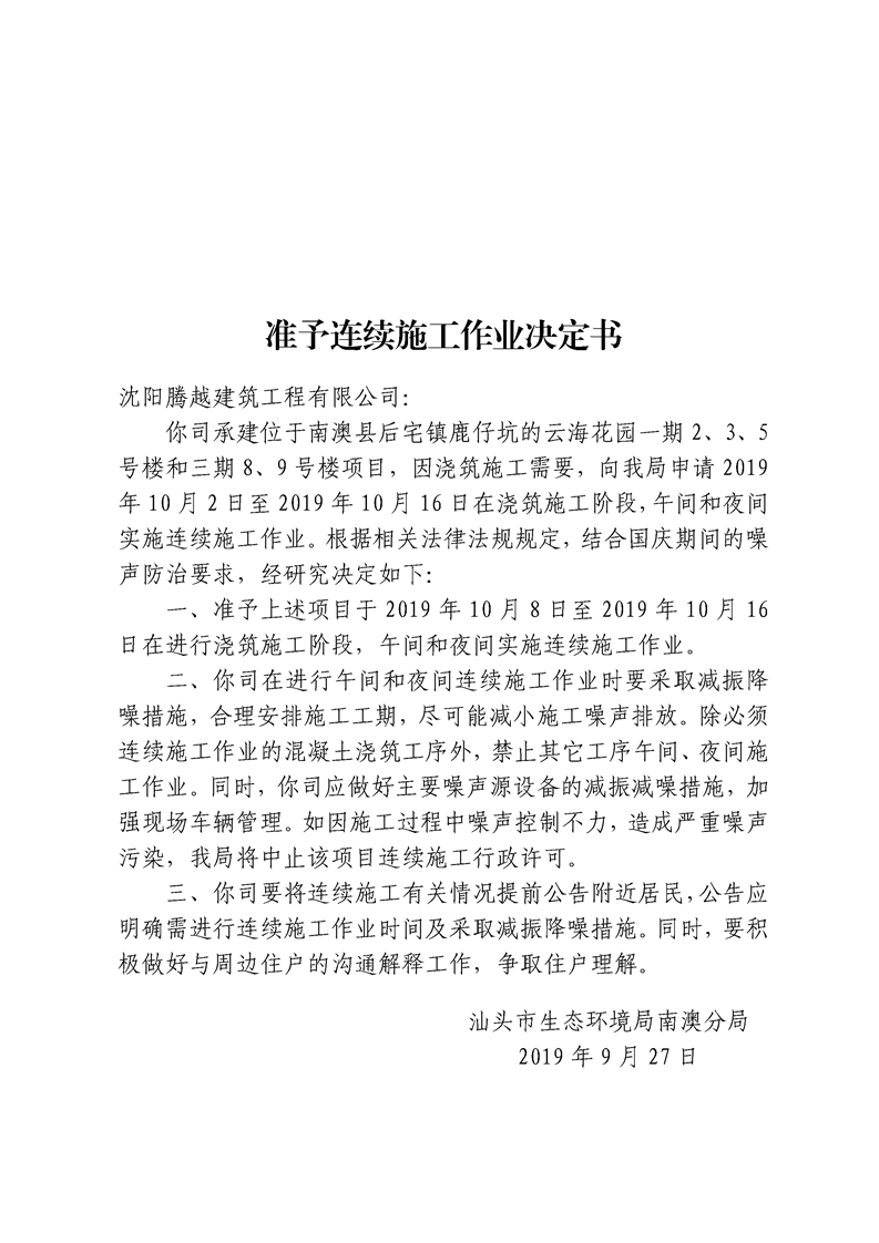 关于准予沈阳腾越建筑工程有限公司云海花园一期2、3、5号楼和三期8、9号楼工程连续施工作业决定书(2019年9月27日)