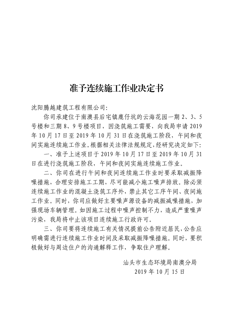 关于准予沈阳腾越建筑工程有限公司云海花园一期2、3、5号楼和三期8、9号楼工程连续施工作业决定书(2019年10月15日)