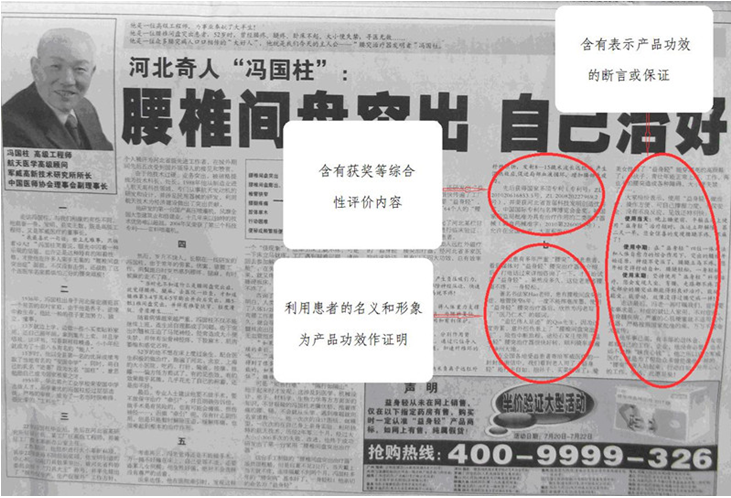 如省局在广告监测中发现,石家庄军威医疗保健器械有限公司生产的“便携式腰椎支撑牵引理疗康复器”为扩大销量,产品推销时存在夸大宣传,宣传中含有以下不符合医疗器械相关法规的内容:一是利用患者的名义和形象为产品功效作证明,广告内容提及一位患有多年严重“腰突”的老患者,试用“益身轻”后没多久便腰腿不疼,一身轻松。二是含有表示产品功效的断言或保证,广告内容提及坚持使用“益身轻”科学治疗,您会发现久坐、弯腰、走路都不疼了,大部分的腰突症都能得到良好治疗,能站、能坐、能劳动,就像没得到腰突症一样。三是含有获奖等综合性评价内容,广告内容提交该产品荣获河北省首届科技发明创造优秀奖、中国国际专利与名牌博览会金奖,以上内容均违反《医疗器械广告审查办法》和《医疗器械广告审查发布标准》,存在欺骗和误导消费者情况。