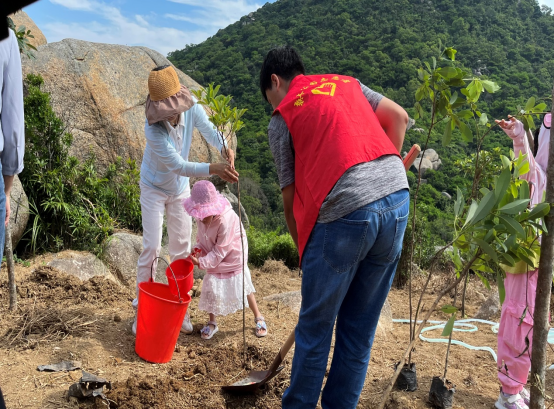 活动现场,志愿者不仅为未成年人及家长讲解了绿美广东生态建设“六大行动”的内容和植树的意义,还对所植树木的特性、养护方法等注意事项进行了详细说明。大家分工协作、齐心协力,扬锄挥铲,培土扶树,踩实新土,提水浇灌。一棵棵小树迎风而立,小朋友脸上满是汗水与笑容,大家在享受植树劳动快乐的同时,也为绿美南澳贡献自己一份力量而感到自豪。