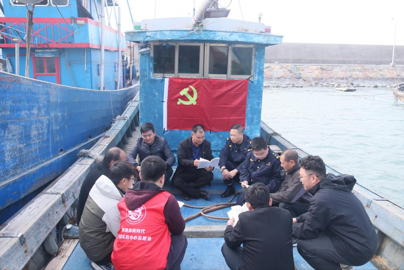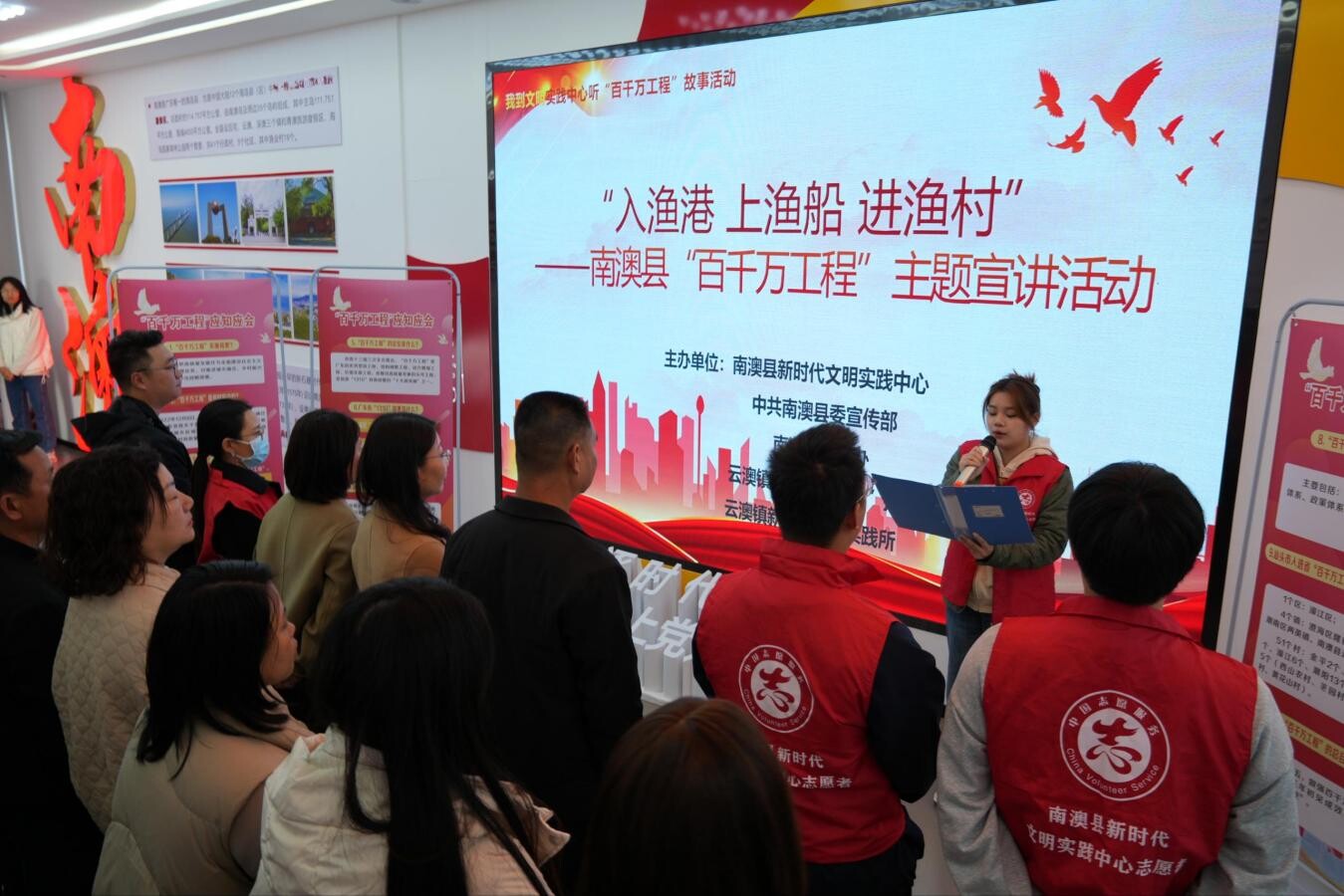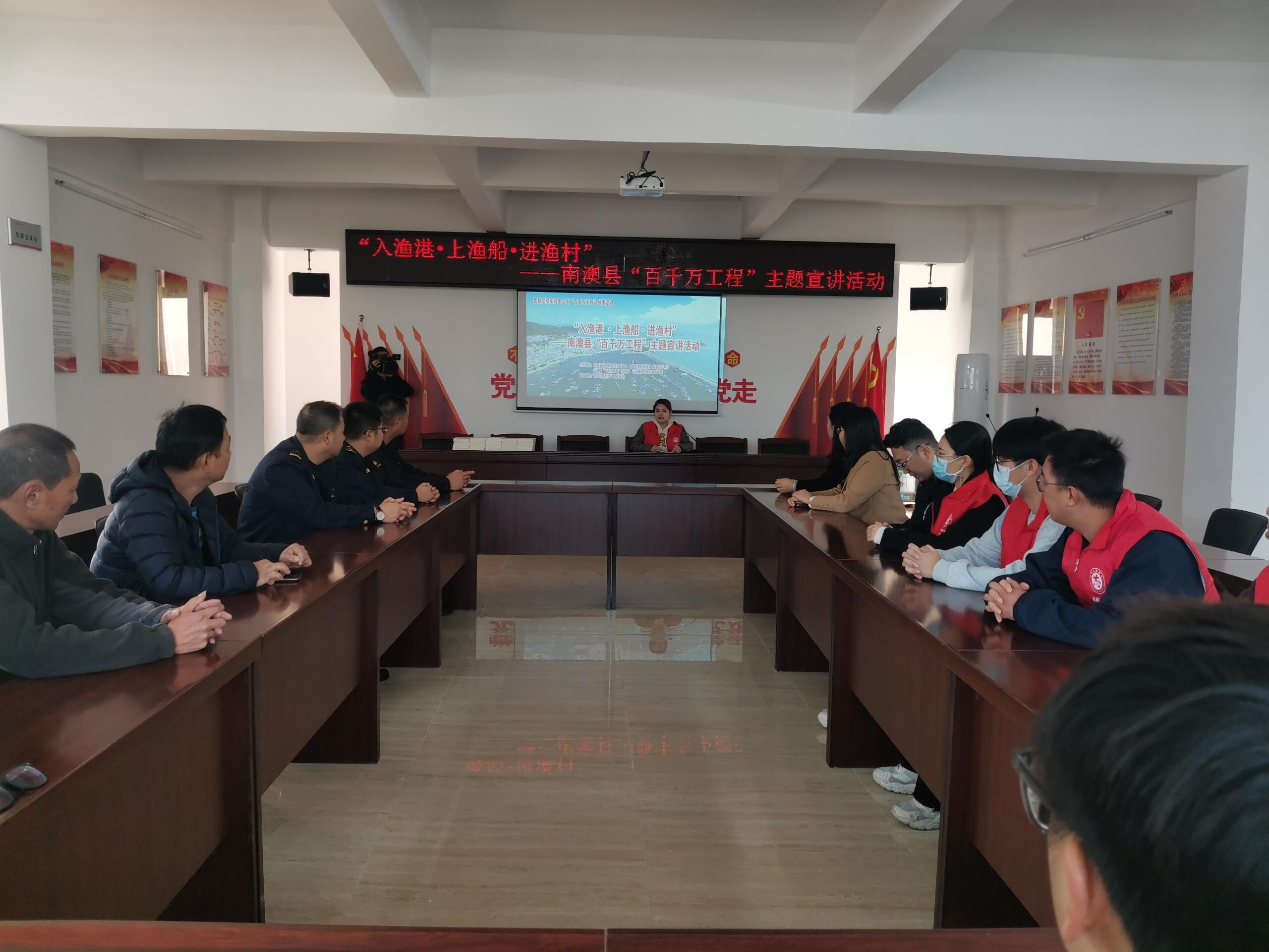 活动先入渔港,在云澳渔港海上党建展厅,县文明实践志愿者向大家讲解“百千万工程”重点工作任务,并观看了云澳镇美丽圩镇“七个一”项目打造情况视频和云澳镇深海养殖项目视频,并向村(社区)党员干部、渔民代表发放《致云澳镇全体党员群众的一封信》倡议书。随后,志愿者们登上渔船,渔民党支部书记在渔船上向渔民们介绍“百千万工程”开展情况,云澳镇海上党建活动室指导员在渔船上还进行渔业生产宣传,得到渔民群众的点赞好评。活动还深入渔村,在澳前村新时代文明实践站宣讲实施“百千万工程”的重要意义,并组织志愿者们进村入户宣传“百千万工程”应知应会知识,进一步提高渔民群众对“百千万工程”的知晓率和参与率。