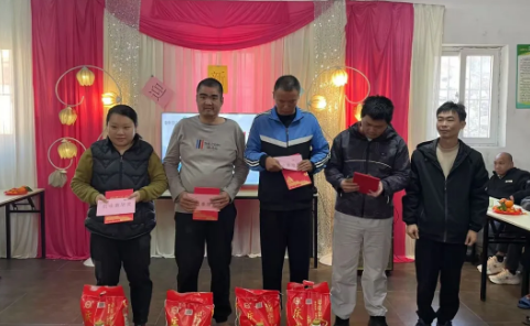 随后,黄副理事长、陈副镇长分别为参加室外劳动年度表现优秀的学员颁发“劳动小能手”荣誉证书、劳动创收激励奖并发放春节慰问物资,黄副理事长鼓励学员们:“大家在新的一年里再接再厉,继续做好自己力所能及的事务,勇敢地融入到康园中心这个温暖的大家庭中,共同创造更加美好的明天”。