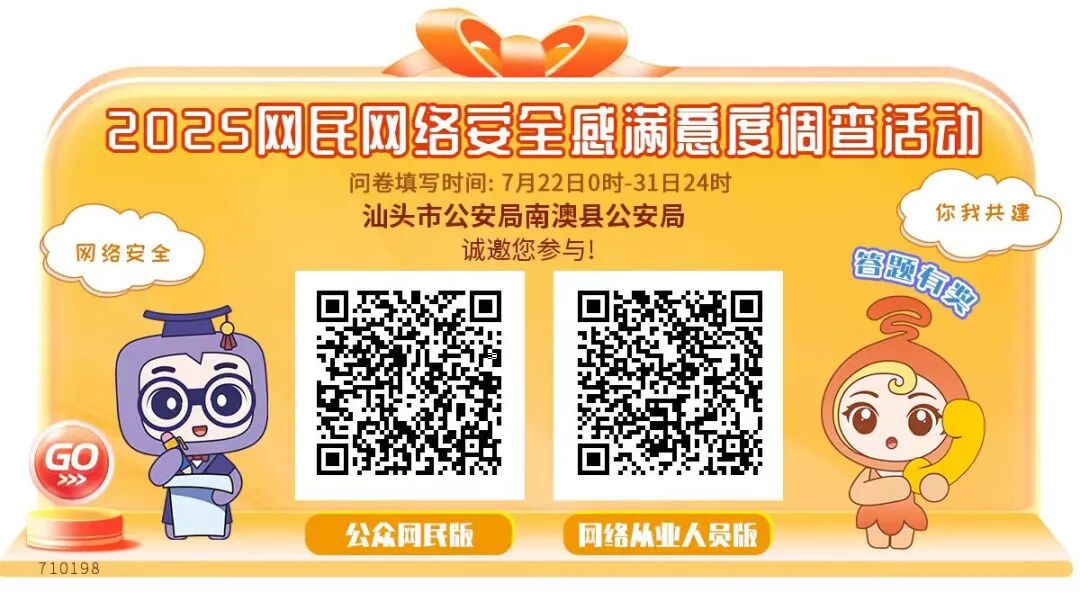 当人工智能(AI)走进您的生活 当每使用一个APP都要注册填信息 当“领个鸡蛋”都需要绑定手机号码 ...... 这个时代 人们的工作和生活越来越离不开网络 那么,上网用网时 您是否有过担心和疑问? 是否遇到过网络安全问题? 这里有一个活动 可以让您表达心声和诉求 —— 2025网民网络安全感满意度调查活动 于7月22日0点全国同步上线问卷 为期10天面向广大网民征集意见! 扫描、长按识别图片,参与答题,写下您上网用网的感受、意见、诉求 动动手指,说说感受 您的想法,我们在意 您的意见,我们想听 2025网民网络安全感满意度调查问卷分“公众网民版”和“网络从业人员版”,除主问卷的共性问题外,还设置了10个公众网民版专题问卷(含1个热点专题)、3个从业人员版专题问卷。为了让数据更科学合理,请您选择适合自己的问卷类型参与调查(建议非专业人员填写公众网民版,鼓励网络从业人员填写两套卷子;老年人群体可选择关怀版答题页面)。 诚邀您参与问卷填写 让党政有关部门听到您的声音 为国家网络安全治理提出建议 来源:汕头网警巡查执法